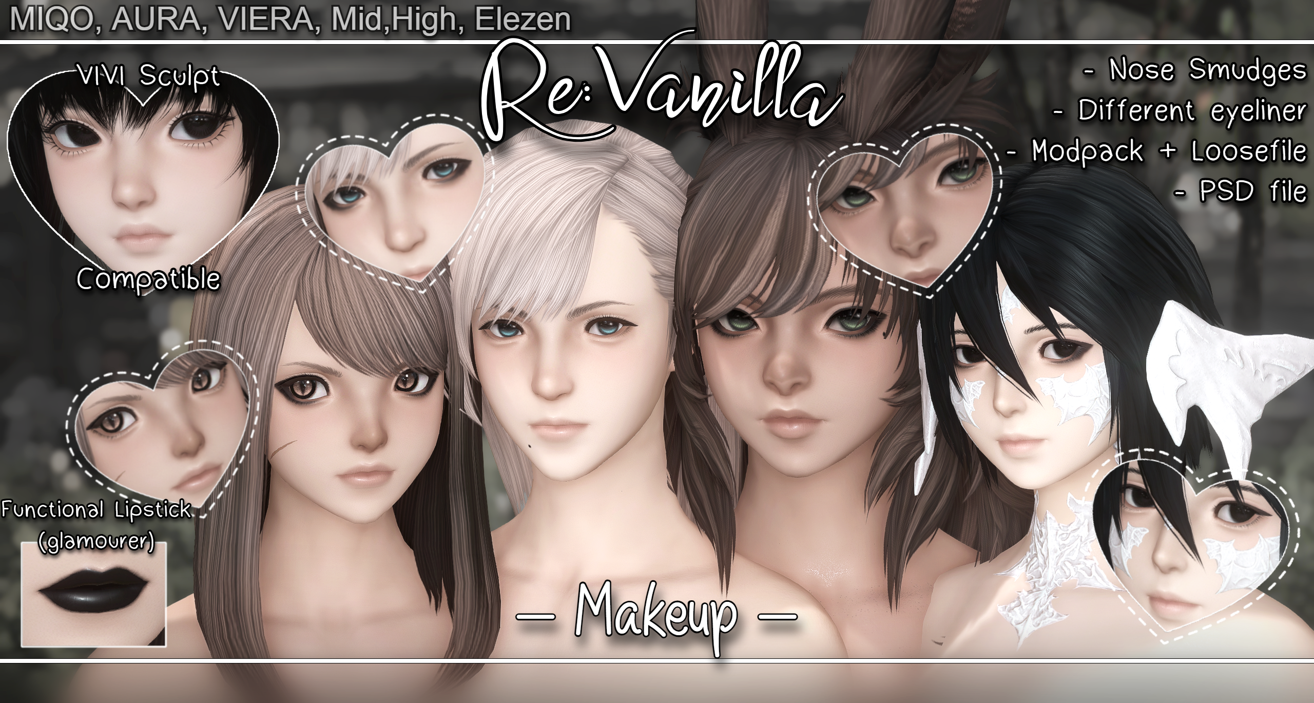 ♡-Miqote, Viera (Default, Clean Eyeliner options) + Nose Smudge versions.
