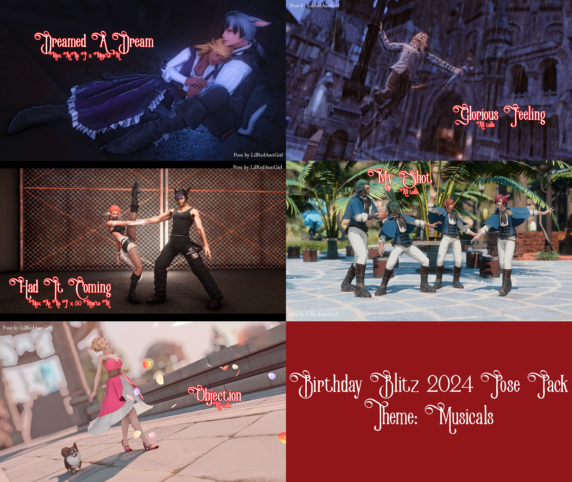 Combined pack of the poses I released during my 2024 Birthday Blitz! The theme was musicals, and it includes Dreamed A Dream, Glorious Feeling, Had It Coming, My Shot, and Objection.